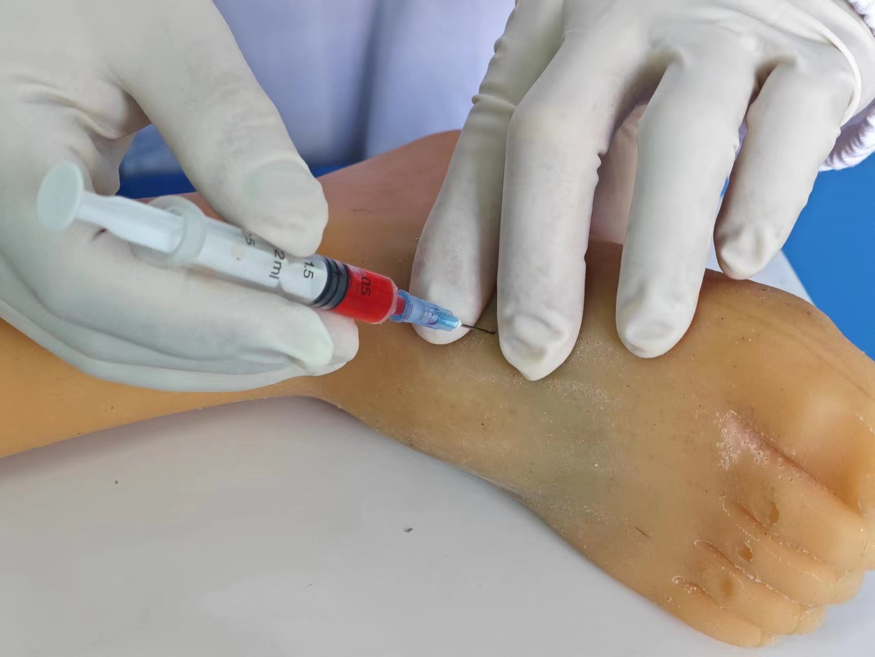 6.做动脉穿刺误穿静脉,血管内压力低,回抽可见暗红色回血。模型仿真度高。